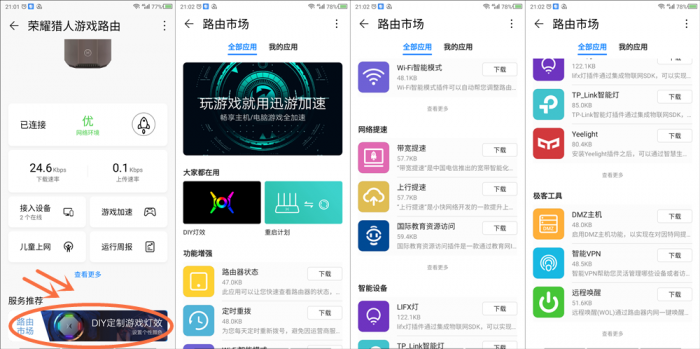 在配置完路由器后,出于好奇下滑至页面底部,惊奇的发现这款荣耀猎人游戏路由支持路由市场功能。市场环境分为四个部分,分别是功能增强、网络提速、智能设备、极客工具几个模块。用户可以根据自身需求添加必要的API功能,模块化的组件设计大大降低了路由器自身的资源消耗,让路由器实现毫无负累的轻装上阵。