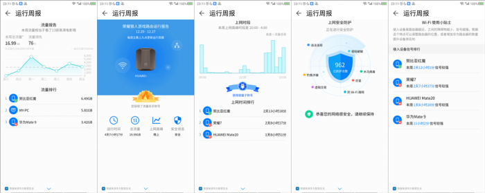 详尽的运行周报会在每周五9点后对用户进行展示,通过向下滑动五联方式为用户展示其一周内的上网情况以及流量使用情况,并且同时还会展示用户集中上网的时段以及期间被拦截的有害信息总数。不过作为游戏路由器,居然没有为用户展示不同设备在一周内玩耍游戏种类以及时长这点着实有些遗憾,若能有该功能久能够更好的了解自己和孩子的游戏喜好,通过报告正确引导其合理安排游戏和学习时间。