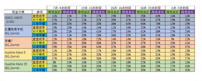 由于测试数据截图接近百张不便于展示,这里笔者将其归纳整理后通过表格方式进行展示。以下数据为五款手机分别在三款游戏下的五个不同时间段延迟、丢包找回率。或许有人会疑问,为何要分时段测试?其实答案很简单,作为商住楼层难免有用户会根据使用时段开关WiFi,亦或是有联网设备进入静默状态但仍交错在看不见的网络环境中占用通道增加干扰。根据不同时段的数据来看,不同手机在不同时段下被优化的数值大小存在很大差异,但在手机上实际游戏体验中经过荣耀猎人路由对数据补偿加持下并未感觉到延迟、掉帧情况。