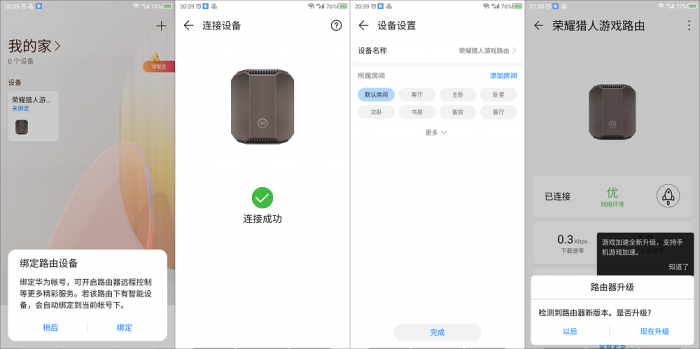 在对路由器进行配网设置后,用户可以通过扫描路由器底部的二维码下载华为的智慧生活APP,通过软件可以将路由器产品注册绑定到应用中以便获得更多的功能。绑定环节与旗下其它产品相同,这里就不在复述了。不过在初次绑定后,APP即会对路由固件进行自检并提醒用户更新最新固件。就个人经验而言,游戏路由器还是及时更新最新固件以便获得最佳的游戏功能体验。