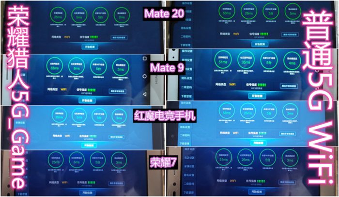 若你表示自己对上面的表格数据看不懂,不要紧,通过《王者荣耀》游戏自带的延迟数据检测让你了解下前后差异。由于移动定制机不支持5GWiFi,所以在Ping值对比上将它做了排除。同左右两侧的延迟对比,还是不难看出两者之间的在响应率上明显存在差别的。