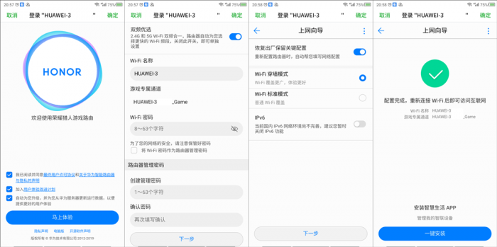 在设置荣耀猎人游戏路由时,可以看到与其它华为路由不同的是,在合并的双频WiFi名称下方多了一项游戏专属通道名称,不过该名称为了避免用户混淆所以不支持自定义,仅支持用户双频WiFi名称后挂载Game后缀使用。并且路由器还率先支持IPv6协议开关,但是由于国内对IPv6支持并不完善,所以官方默认关闭状态。简单的四步操作除了WiFi名称、密码之外,其它步骤几乎无需用户进行设置干预。