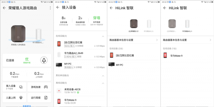 此时,当用户在进入荣耀猎人游戏路由器控制界面时,就可以看到互为通信的两个路由器图标,并且在接入设备中可以看到作为从路由的华为A2设备。并且用户还可以在Hi-link智联栏目下,通过点击对应的路由器图标查看当前哪些设备接入到其名下。