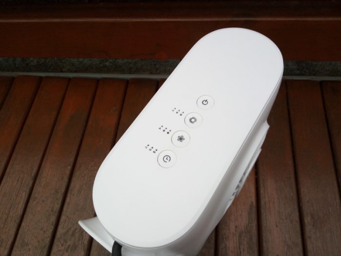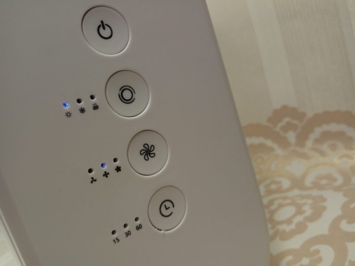 右侧是操控区域,依次是待机按键、模式选择键、温度档位键和定时选择键。每个按键上都印有相应功能的标识,方便快速识别各按键功能。选择键旁边还有每个选择的led灯,会在工作中亮起当前状态下的led灯,方便了解暖风机的功能状态。