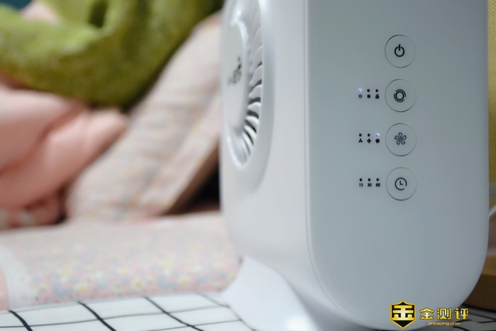 小尼熊暖风机设计有四颗按键:开关、暖风档位、风量、定时四种功能按键。