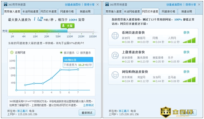 网速测试对于网络的要求还是非常高的,同时通过网速测试可以看到目前网络速度和打开速度到底如何,我家里的网络为电信的100M光纤入户,实测最大的下载速度为11.2MB/秒,无论是打开网页的速度还是访问其它网站的速度都非常的快,所有就算你的好的网速,如果没有好的路由那也是白搭,而华为路由A2搭配电信的100M完全就是最佳组合。