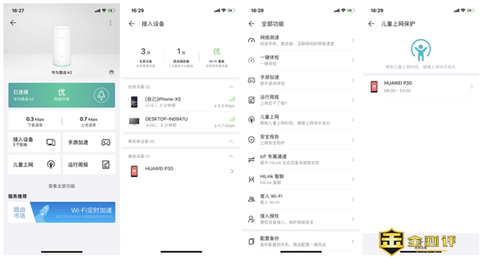 从管理界面上看其实和PC端的还是有些区别的,首先一点是比较的简单化,并没有想象的复杂,基本上从来没有设置过的人群,都会跟着提示可以轻松的设置完成,而且支持远程管理、上网保护、商城购物、客人Wi-Fi、Wi-Fi定时开关、玩转智能设备等,尤其在儿童上网保护和防沉迷上做的非常好,通过华为智慧生活APP,对儿童设备进行时长/支付/游戏/视频/社交限制等,合理规划孩子的上网时间,有效防止孩子沉迷于游戏,视频以及各类社交APP,同时对于老人上网上,也进行了路保护和防欺诈,能够自动识别并拦截虚假购物,虚假中奖,木马下载,窃取手机号,博彩等恶意欺诈网站,预防老人被网络欺诈而导致财产损失。