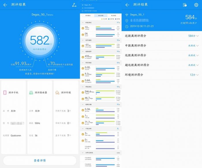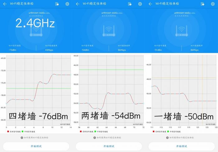 而且,和常见的四天线结构的普通路由器不同,这款华为A2内部配备了六颗独立大功率信号放大器和六颗高灵敏度信号接收器,所以信号覆盖范围更广,实际使用当中,这款路由器的2.4GHz信号,即使穿过了4面实心砖墙,依然可以获得能够正常使用的信号,实际信号强度为-76dBm,速率为43Mbps,基本可以正常浏览一些网页,比起其它路由器接近没有的-82dBm的信号强度要好上很多。至于常见的一两堵墙的使用环境,通过华为路由A2的2.4GHz频段,可以获得的信号强度在-50dBm左右,相比于其它路由器-60dBm左右的表现,华为路由A2明显更加出色。