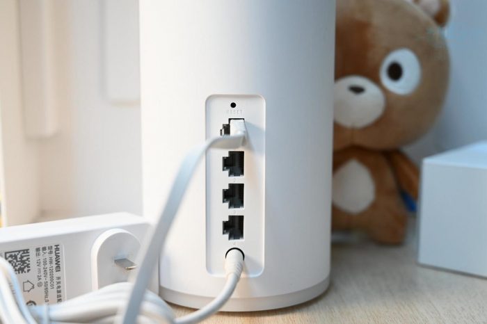在设计上,这款路由器有几个细节做得很好,其一是在顶部设计了NFC一碰连接的功能,针对具备NFC功能的,华为荣耀手机,可以免密码迅速连接路由Wi-Fi,支持NFC的其它品牌手机也可以获得有限的支持;其二则是它的四个网口不分WAN和LAN,而且都是千兆网口,这样在日常使用当中会更加方便;其三就是这款路由器也有一个Hi键设计,可以为手机等设备实现免密码一键连接。