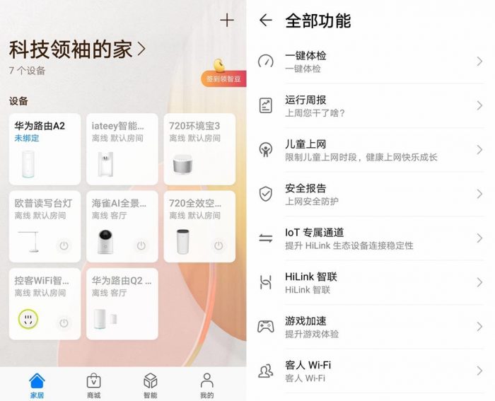 其中手机设置所需要的APP就是“智慧家庭”,这需要通过华为账号来登录,但是不登录也可以完成很多的设置,比如Wi-Fi等方面的路由器配置,都能够用“智慧家庭”很方便的完成。而且“智慧家庭”也是很多其他华为荣耀物联网设备的管理APP,有了华为A2路由之后,还可以对华为荣耀物联网设备的接入和管理带来方便,其中免密码接入就是一个特别方便的功能。