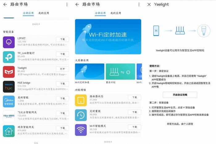 另外,这款华为A2路由器还可以支持插件的安装,从而获得更多的功能,目前在华为的路由市场里面,已经有了不少插件选择,而且即使不安装插件,类似关注物联网设备安全的智能设备保险箱,针对儿童上网保护的功能,也都是这款路由直接提供的。而且通过插件的扩展,可以让这款路由器不只支持华为荣耀的物联网设备,类似美的、YeeLight等品牌的智能家电产品,都可以获得更好的支持和保护。