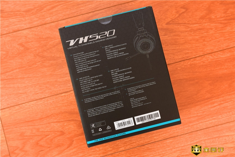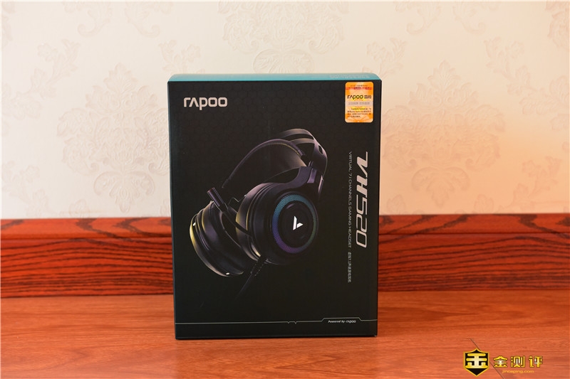 包装正面为这款耳机的渲染图,左上角有雷柏的的英文LOGO RAPOO,右侧则是耳机的名称VH520。