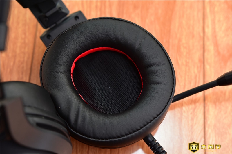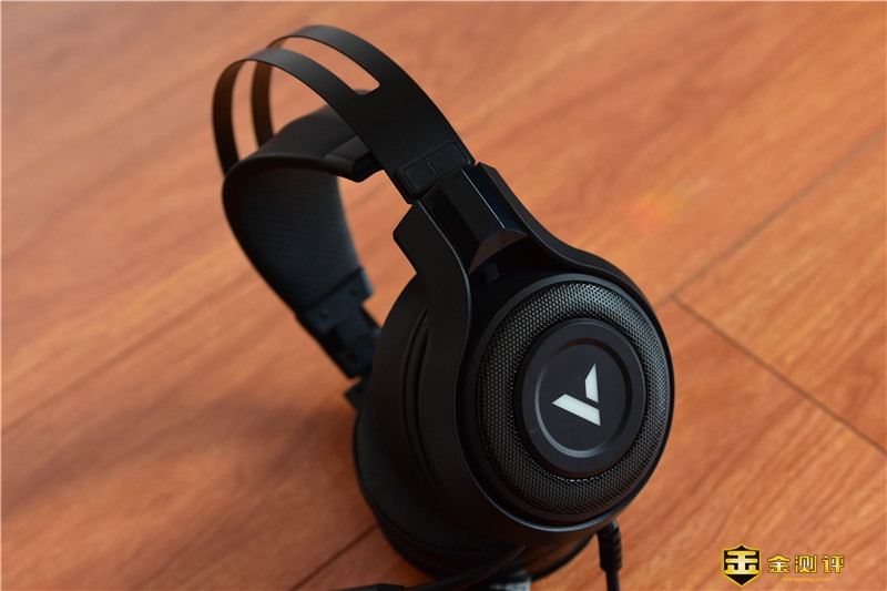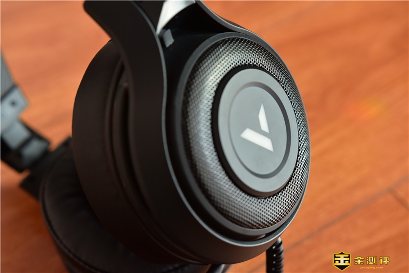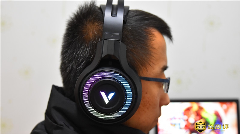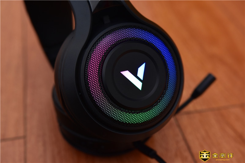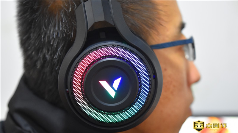 耳罩外侧V字形标识的周围采用了金属铁网的材质,营造了很好的战斗氛围,铁网内则是RGB流动灯光带,夜间使用辨识度更高,靓丽炫酷。