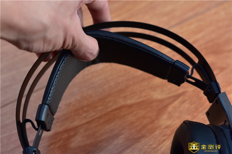耳机的头带采用了悬浮式设计,顶部的耳机骨架和下方的皮质头带之间有一定的空隙,皮带可上下伸缩,以适应不同头型。