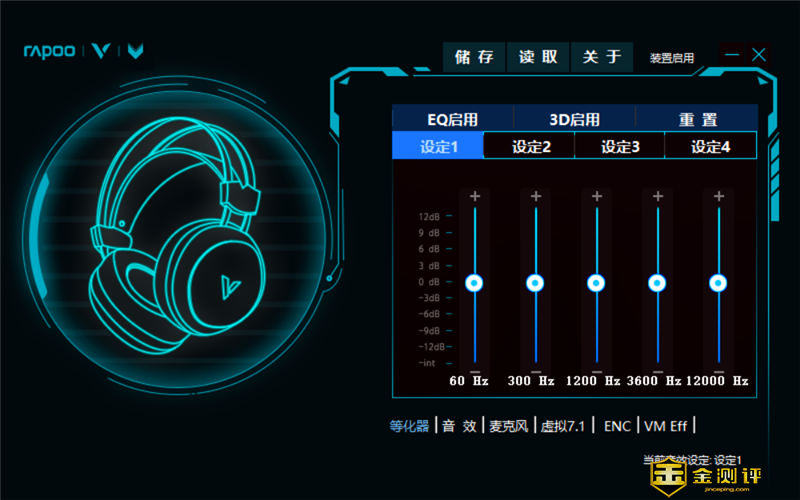 这款耳机还可以通过专属的游戏驱动,进行个性化的定制。驱动的首页提供了4种可编辑的个性化设定,每种设定均可对耳机的高、中、低频进行调整。