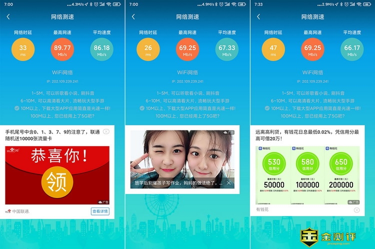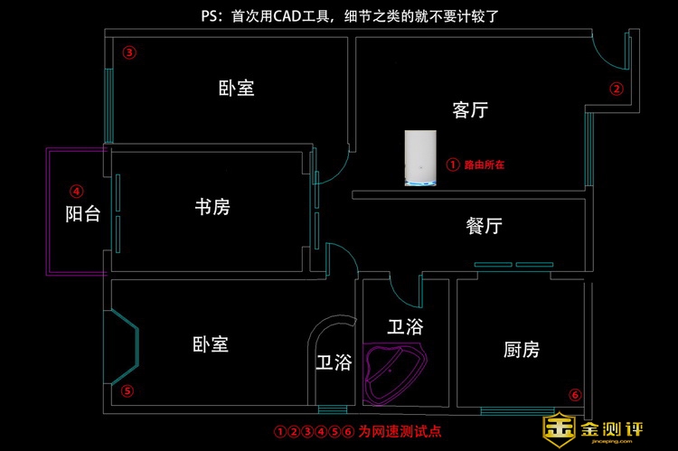 话说之前使用其他路由器,一直都有碰到第3,5点网速极差的情况,但是华为路由A2给了我不小的惊喜,看来华为路由A2内置6颗独立大功率信号放大器不是盖的,效果出色呀。所有数据测3次去中间值。第1点在路由器旁,最近,评论速率86.19Mb/s;第2点在门口,距离路由器近,而且无障碍,平均速率67.33Mb/s;第3点距离路由器远,而且有面墙,所以一般这里速率会降低,但是这次是66.17Mb/s;第4点阳台,距离远,直线,有一扇落地窗,速率为61.94Mb/s;第5点是主卧,也是墙,平时这个点也不太好,这次速率为63.29Mb/s,第6点厨房,与路由器直线距离近,不过有层电视墙,速率为 70.83Mb/s。还是头一次6个点的速率都很接近,而且很快。华为路由A2的WIFI覆盖范围很广呀,一个华为路由A2就能完整覆盖我全屋。
