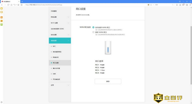 华为路由A2具有四个WAN/LAN自适应全千兆的网口,这个WAN/LAN自适应功能可以在网口设置里修改,可以指定固定的WAN口,但是还是盲插比较爽。并且我接入的网口在这里也会显示,比如我现在接在了网口3,速率是1Gbps,这个功能好,不用测速,不用开电脑就能检测网络速率。我房子当年装修的时候,网线水晶头很多没做好,所以后来我入住使用才发现很多都是百兆速率,然后开始一一排查,花了不少时间,如果当年路由器能有这个功能,那就省事了。