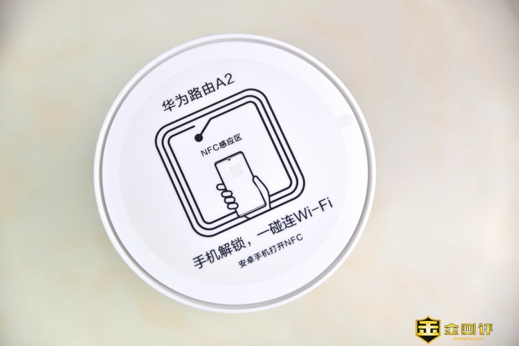 机身的顶部是华为路由A2的一个特色功能的所在,就是一碰连WIFI,上面有详细的说明,手机解锁,并开启NFC功能,然后只要将手机的NFC感应区放在机身顶部,就可以实现一碰连WIFI,轻松连接WIFI,无需输入密码。