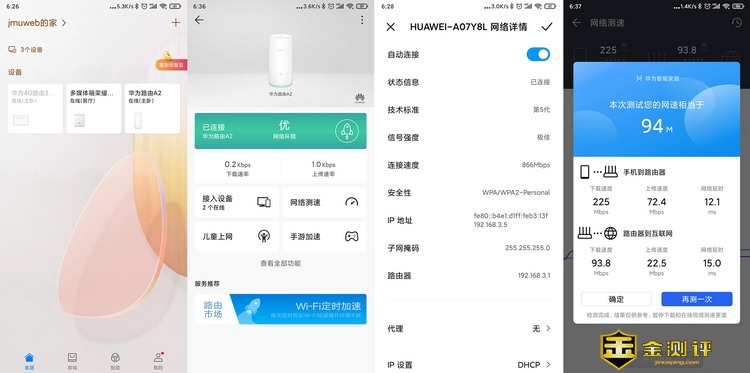华为还有个智能家居APP,可以用来管理华为的路由器和其他智能产品,APP里的功能大体和WEB端是一样的,主要是智能家居APP可以实现对路由器的远程管理,这点很方便,我顺便测了速,最终提示94M,这个倒是差不多,我家现在还没光改,只是网线如何,100M宽带的速率差不多就这样了。话说我家这栋楼的光纤我看都拉了半年多了,就是死活不来光改,电信没效率呀。