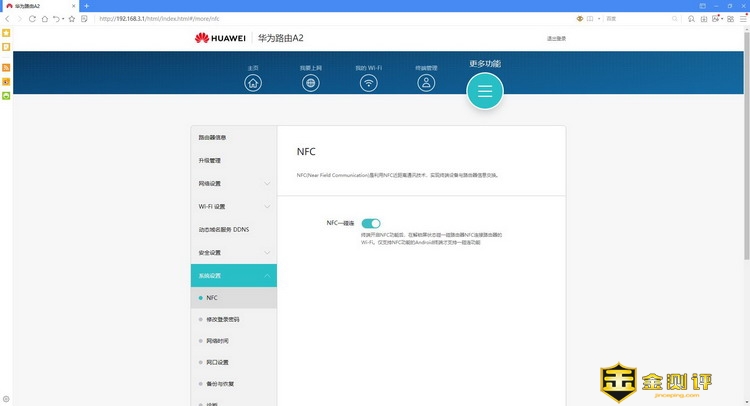 其他的功能跟大多数路由器都是类似的,不过系统设置里的NFC功能,就是华为路由A2独有的,这个功能默认开启,而且NFC一碰连这个功能仅安卓手机支持,苹果手机还不支持。