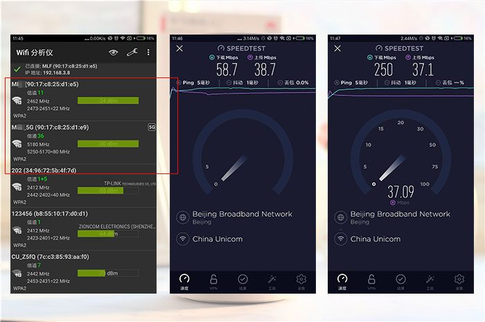 A点,2.4G无线网络的信号强度为-24dBm,下载为58.7Mbps,上传为38.7Mbps;5G无线网络的信号强度为200dBm,下载为250Mbps,上传为37.1Mbps。