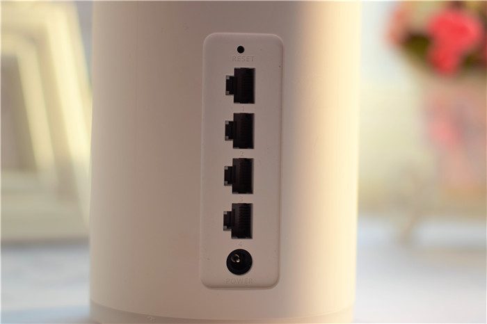 路由器的背面设计有4个千兆网口,同时,并没有区分LAN和WAN,大家可以根据需要使用;同时,四个网线接口的上方设计有reset键,下方设计有电源插口。