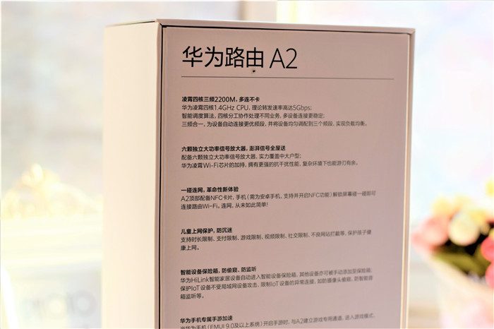 华为路由A2包装采用白色作为主色调,包装的正面印有产品的名称、实拍效果图等等,方便我们队路由器有一个直观的认识;包装背面则印有产品的一些主打特点。