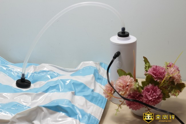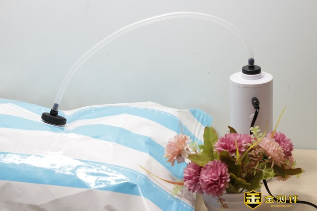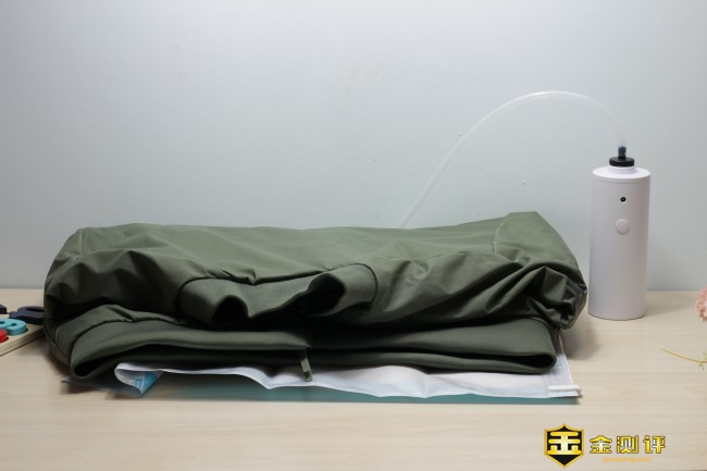 密封好外套夹克,然后将主机与收纳袋进行连接开始进行抽真空的工作。