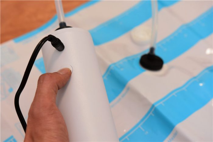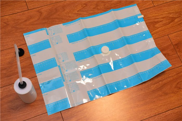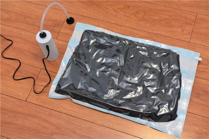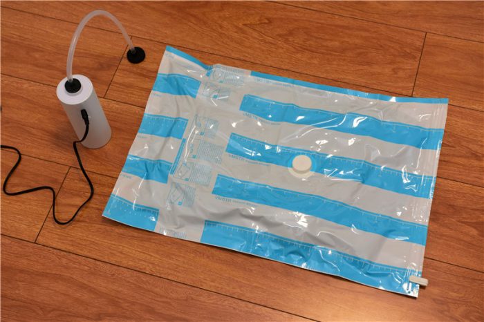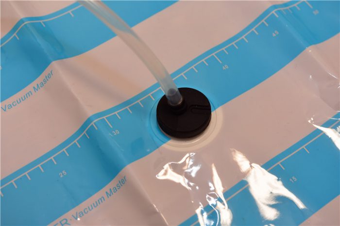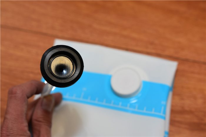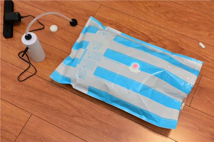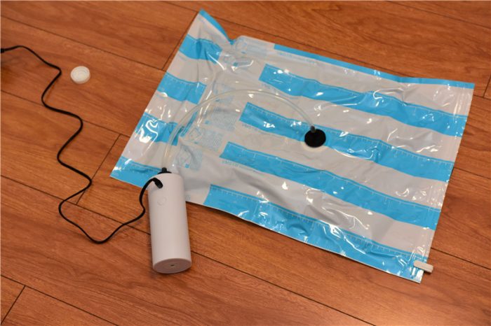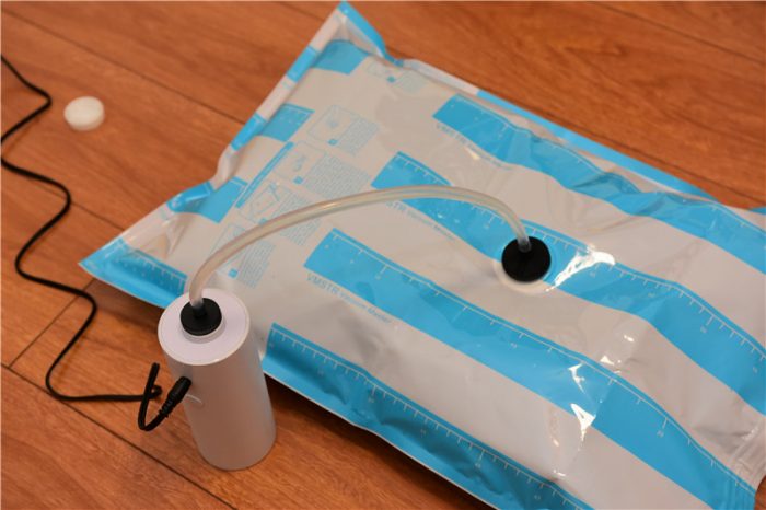 收纳完成并合好袋口后,我们便可以将抽气管的胶垫和收纳袋的抽气孔扣紧,进行抽气。