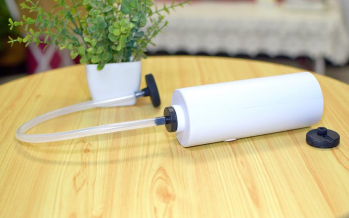 抽气机非常小巧,采用ABS材料机身,外观尺寸为173*65*65mm,重量约为400克,跟我们日常使用的保温杯差不多,侧面有电源插口以及一只开关按键