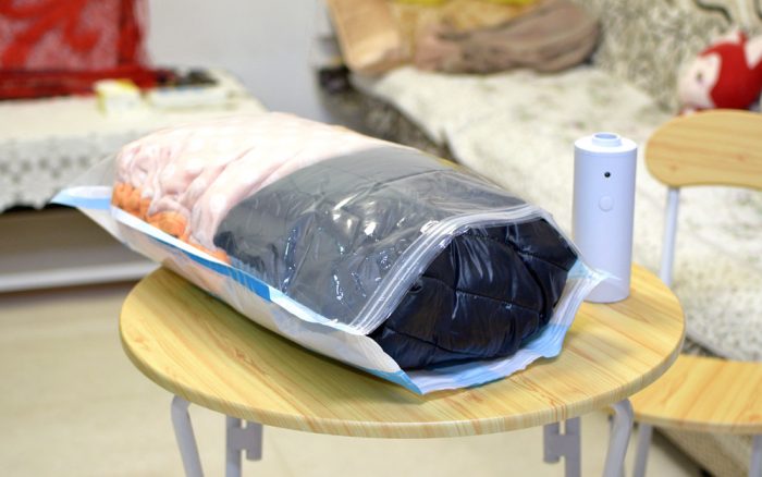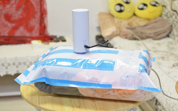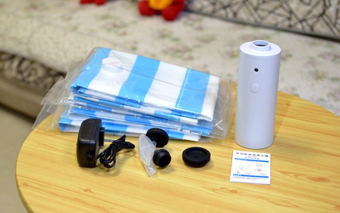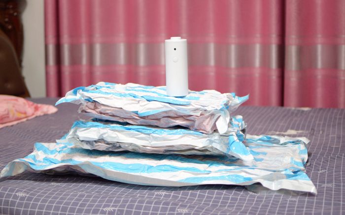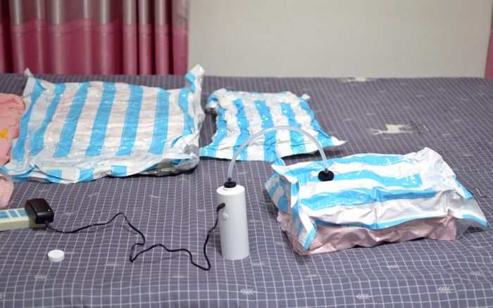 装好衣物配套的压扣,将袋口来回拉几次进行密封,再扣上真空抽气机,插上电源,按一下开关,机器就开始工作,这台真空抽气机的效率还是很高的,相对于那种手动/电动抽气机,这款产品具有速度快、噪声低等特点。