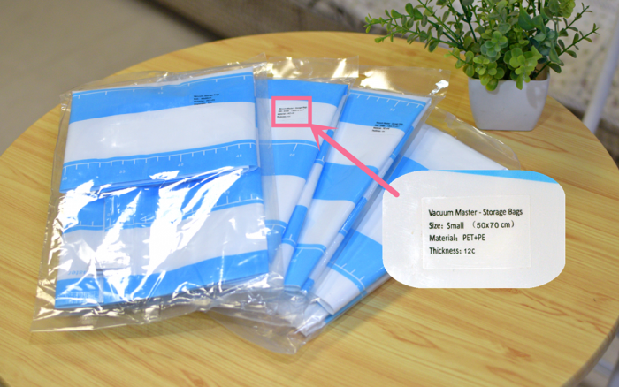 小编这套真空收纳套装,包含4只收纳袋,大中小以及超大号各一只,尺寸分别为40*60,50*70,60*80,80*100厘米,密封袋上印有尺寸参数。PET+PE材质密封袋,非常的厚实耐用。