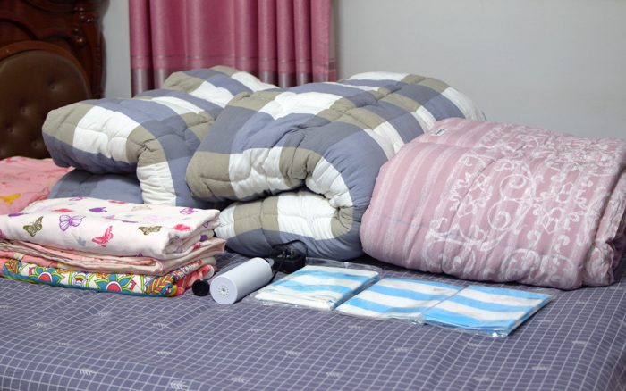几分钟的时间,连装加抽真空,百安思真空收纳机还是非常给力的,原本占满整张床的厚厚的被子,被这三只收纳袋轻松装下