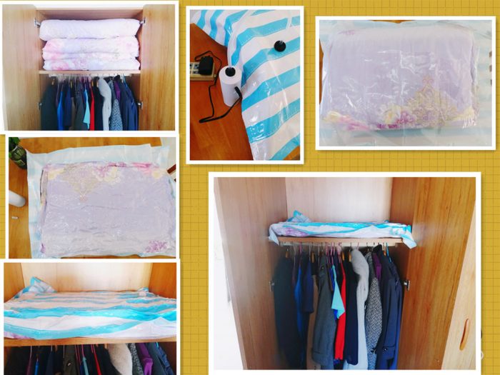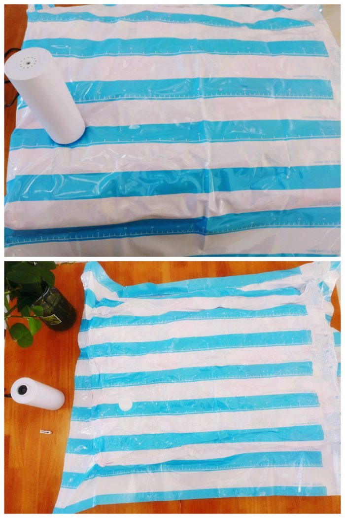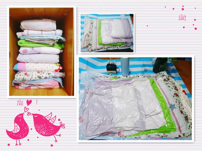 被子的收纳效果更佳明显,原本厚厚的羽绒被,压缩后就真的只是薄薄的一片,效果如下图: