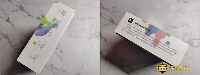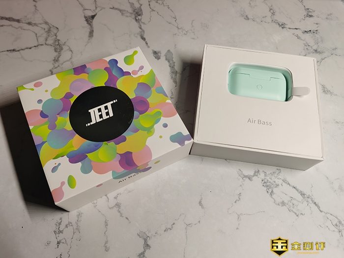 包装上介绍了JEET AIR Bass的特色:高通aptx CVC8.0降噪、7nm动圈单元钛金振膜、单边仅4.9g佩戴如无物、智能APP操控单双耳独立使用、单词续航7小时总续航24小时、IPX5运动防水。