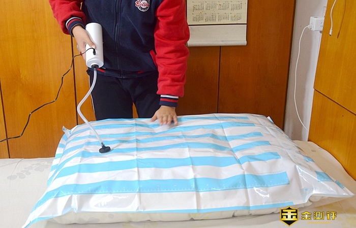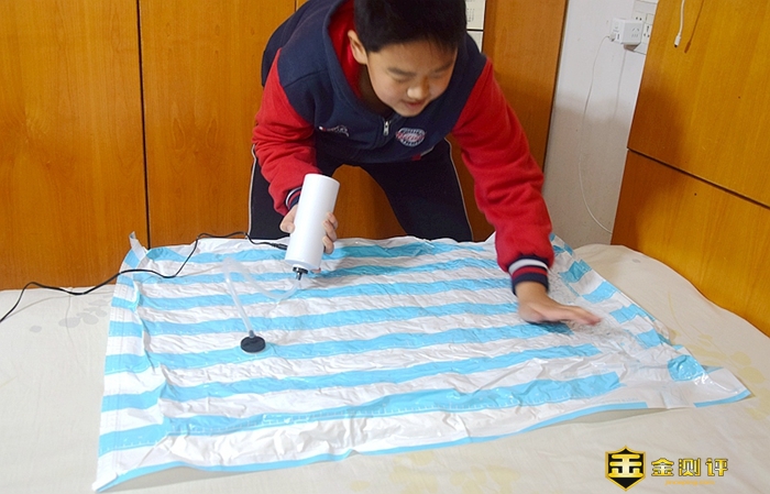 很快一床又大又厚的被子便被压缩成薄片状态了。孩子依然轻松自如的搞定了。对于抽气泵他已经使用的得心应手的。