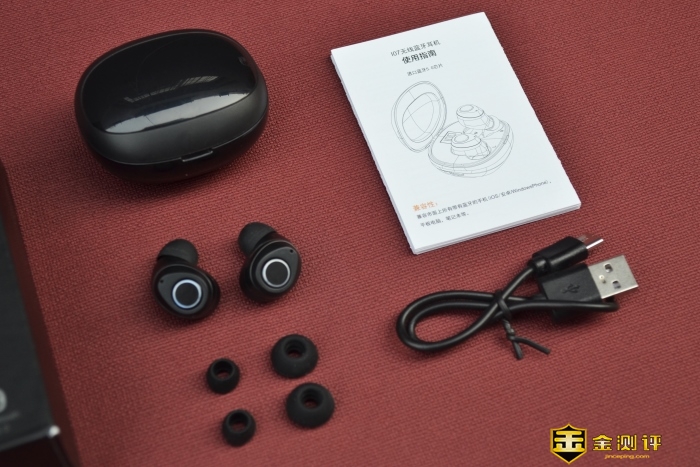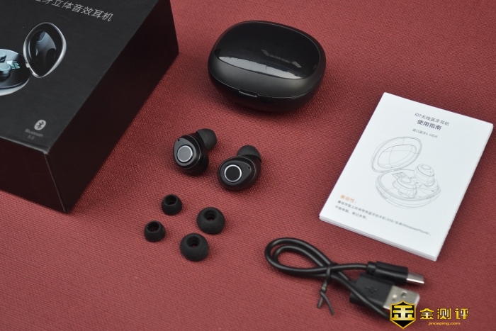 我们一起开箱,包装盒,耳机充电仓,无线蓝牙耳机I07,大小各一款的耳套,耳机使用说明书,Type-C充电线一根。