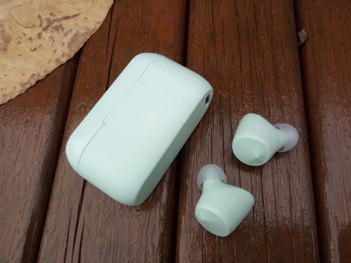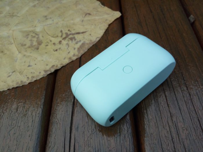 充电盒外观采用了浅绿色设计,和甜品马卡龙中的一款配色一样,除此之外还有浅粉色、渐变紫和渐黄色等多款可选择,均适合女生使用。上端采用了钢琴同级高光封釉工艺,背面有个蓝牙配对键,长按即可开启耳机蓝牙配对模式,这样的功能设计还比较少见。