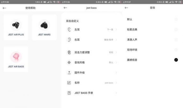 耳机支持APP设置操控和升级耳机的固件,可以用手机随时掌握耳机的工作模式,这在以往使用的蓝牙耳机中比较少见,比较开发个APP的费用不少。APP中有多种自定义设置,可以根据音乐选择适合的音效场景,有轻柔古典、清澈人声、现场环绕、震撼低音可选择,方便不同需求的人群。