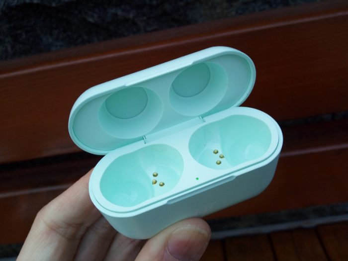 充电盒整体小巧轻便,能轻松放入口袋,外出携带方便,下端设有Type-C充电接口,兼容性比较好,与安卓手机线通用。盒内比较紧凑,有两个与耳机轮廓吻合的充电槽,还有led电量指示灯,能在耳机不同工作状态下显示不同的灯光。