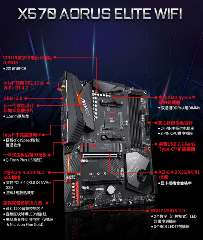 技嘉(GIGABYTE)X570 AORUS ELITE WIFI “电竞精英”主板(AMD X570/socket AM4)