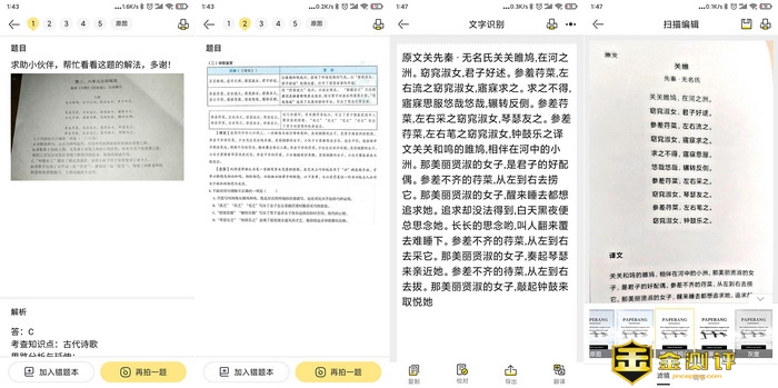 然后根据图片内容,APP会自动搜索相关的题目,关于《关雎》APP提供了5个不同的题目,这就很厉害了,对于学习来说,这是个很好的辅助方式。更进一步,OCR识别,可以把图片内的文字是识别成文本,虽然有些错误,但是整体精度还是很高的,毕竟首先我打印出的纸有些弯曲,不是完全平整摆放,其次是字小,所以能有这样的识别精度,我是很满意的。相对于原题拍印,扫喵王也是差不多,就是不能归类到错题本那边而已。