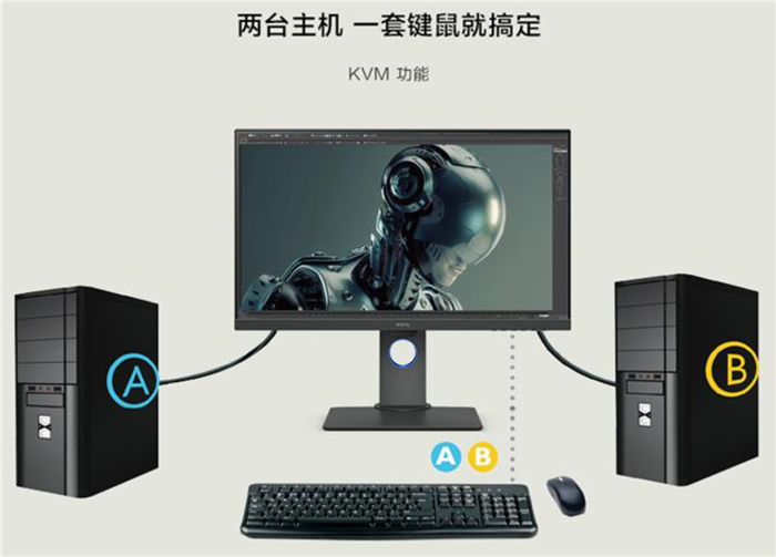 KVM是多计算机切换的意思,其实就是Keyboard(键盘)、Video(显示器)、Mouse(鼠标)三个英文单词的首字母缩写,表示我们可以通过一套键鼠和显示器实现对多台设备的控制 ,从而节省空间,提高工作效率。而控制设备的数量与KVM端口的数量有关,PD2700U具有2个USB-B端口,因此可以搭配一套键鼠同时控制两台主机。