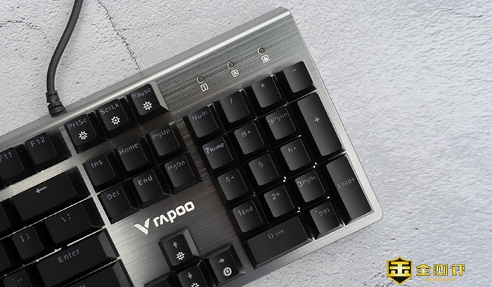 雷柏V530采用了104健全尺寸键盘设计,可以说非常切合大众的使用需求,因为它不仅有着合理的按键面积,还保留了小键盘区,可以更好的兼顾游戏与工作这两种完全不同的使用场景。