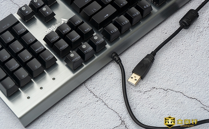 雷柏V530采用的是不可拆卸的USB数据线,这也表达出了V530的使用环境,同时在USB接口处设置了防静电磁环,可以防止周边信号的干扰,保证传输稳定,全键位无冲突。