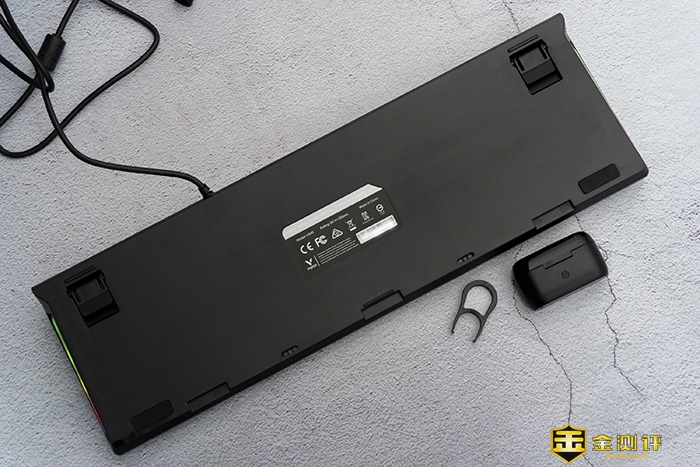 雷柏V530机械键盘在背面4脚位置设计了硅胶防滑垫,其中顶部的2个防滑垫可进行一级调节支撑。