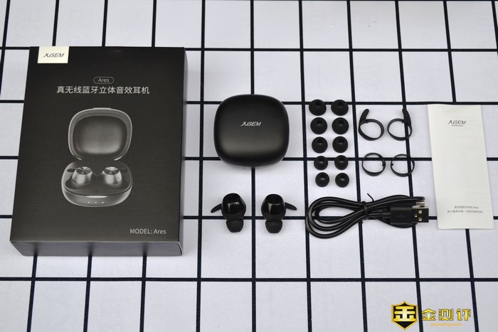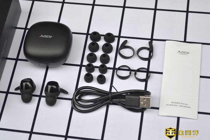 开箱全家福,XISEM/西圣战神Ares真无线蓝牙耳机,充电仓,可更换的耳塞,Type-c充电线,使用说明书。