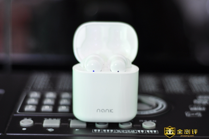 充电仓采用圆润的外观设计,外表面烤漆亮面处理,底部是NANK的LOGO,LOGO的下方是半隐藏式的充电仓指示灯,在不同电量下呈现不同颜色。
