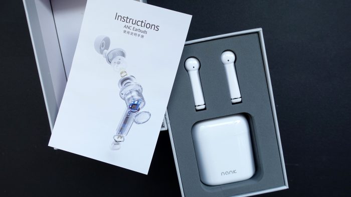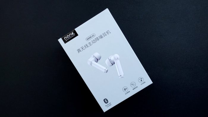 包装盒的左上角位置有一处“nanic”的南卡公司LOGO标识,同时在包装盒正中央靠上是南卡A1的名称和“真无线主动降噪耳机”字样的简单说明。