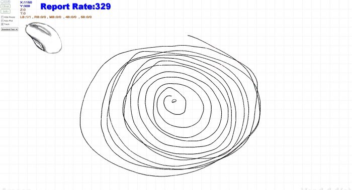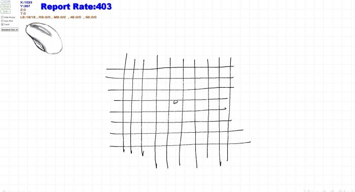 通过上述简单的配置后就可以对上手体验这款鼠标的性能了,在这一章节主要通过两款测试软件对罗技G102二代进行详细的测试,先来看看经典的蚊香图和井字图,通过观察这些点的位置和间距可以看到罗技G102二代偶尔出现丢帧现象,滑动轨迹还比较平滑均匀。